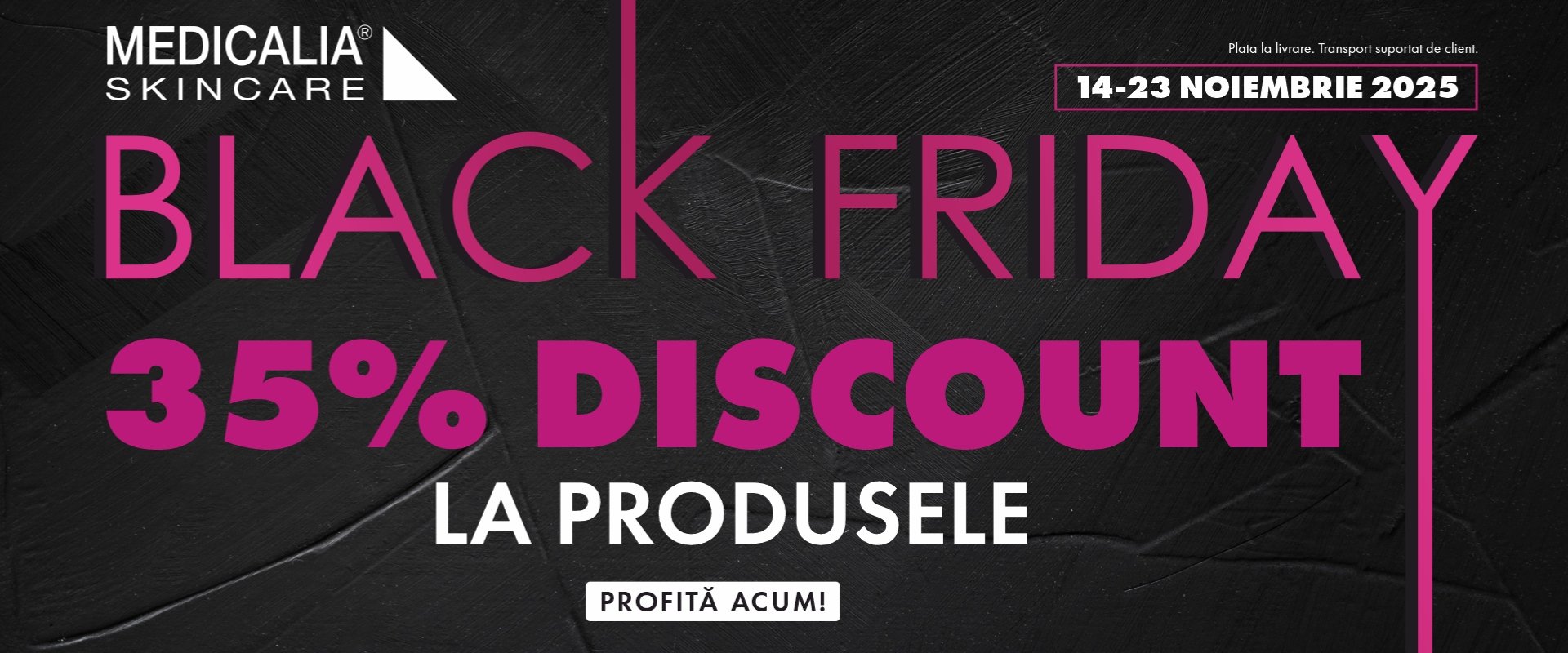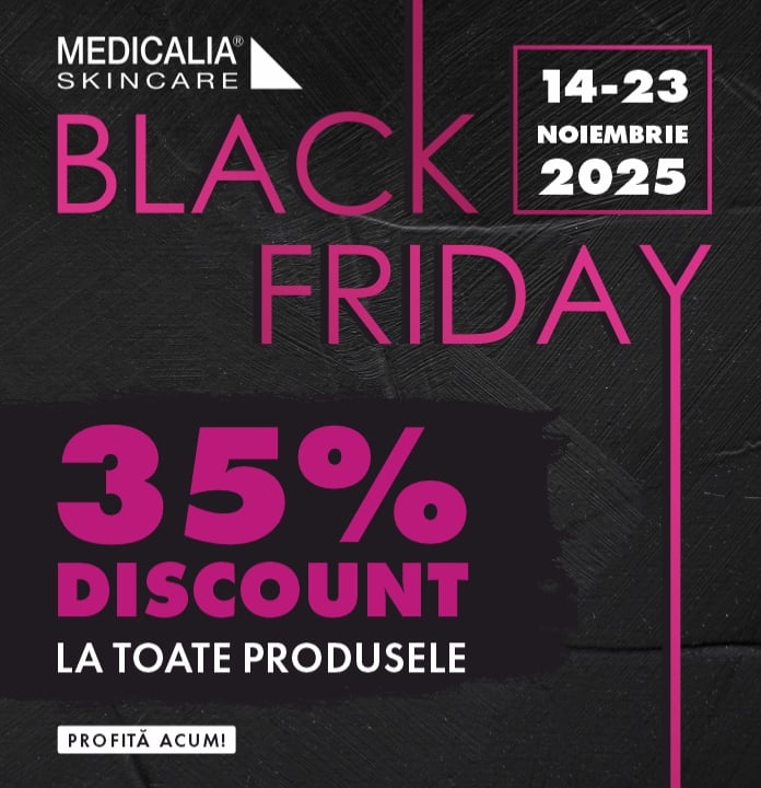 De Black Friday, te bucuri de 35% reducere la toate produsele – de la tratamente pentru ten sensibil sau acneic, până la soluții anti-aging și post-procedură.
